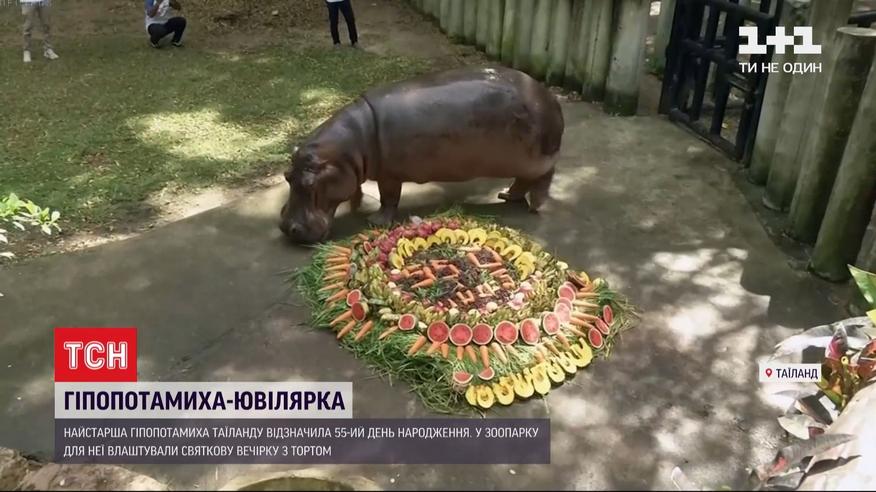 Старейшая гиппопотамиха Таиланда отметила 55-летний юбилей. Имениннице устроили праздничную вечеринку и приготовили огромный торт из ее любимых фруктов. Десятки посетителей пришли в зоопарк поздравить юбиляра. Гиппопотамиха Маэ Мали, что в переводе означает Мать Жасмин, самая старая представительница своего вида в Таиланде - десятки ее потомков живут в зоопарках по всей стране.
