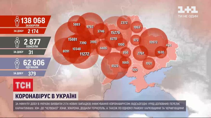 Плюс 2174 больных COVID-19. Столько новых случаев инфицирования подтвердили в Украине за прошлые сутки. 31 человек умер, 379 выздоровели. Больше всего новых случаев в Киеве, Львовской и Тернопольской областях. С сегодняшнего дня в Украине новые карантинные зоны. В частности, в "красную зону" добавили Тернополь, а также по одному району Харьковской и Черниговской областей. В "красной зоне" остаются отдельные города и районы Прикарпатья, Буковины, Тернопольской, Ровенской и Одесской областей. Столица остается в "желтой зоне".