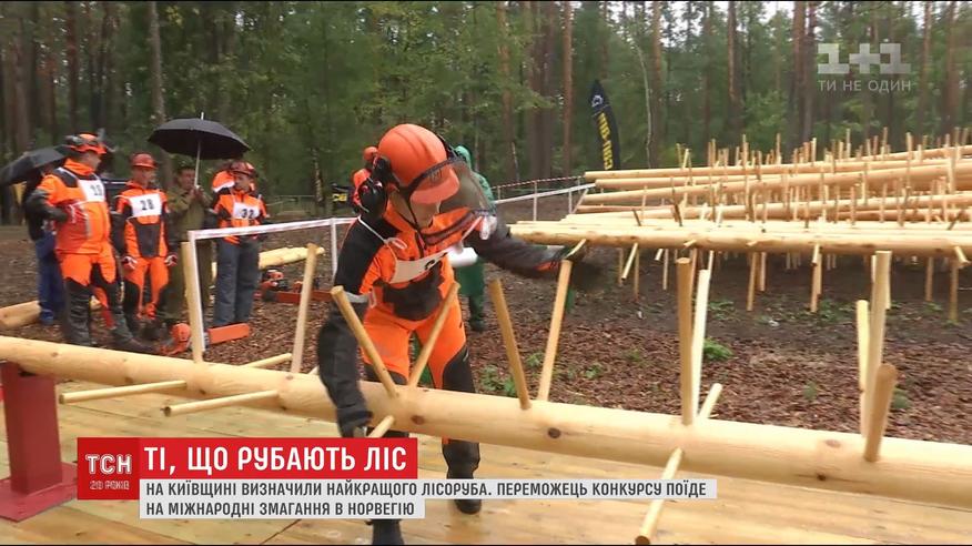 Мужчины орудовали бензопилами на скорость. Конкурс проводится уже в двадцатый раз. Все для того, чтобы популяризировать профессию. В Украине каждый день держат лесозаготовительный инструмент 40 тысяч мужчин.