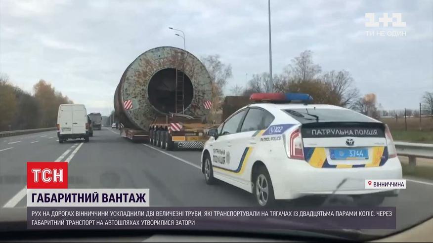 Переполох на дороге. Движение на автодорогах Винницкой области накануне парализовал необычный груз. На тягачах с двадцатью парами колес в сопровождении полиции транспортировали две огромные трубы. Каждая - диаметром с десяток метров. Из-за габаритного груза на дорогах образовались большие пробки. Водители снимали все на видео и выкладывали в сеть. Ходили разные версии и о назначенном груза. Позже выяснилось - это транспортировали оборудование для цементного завода.
