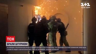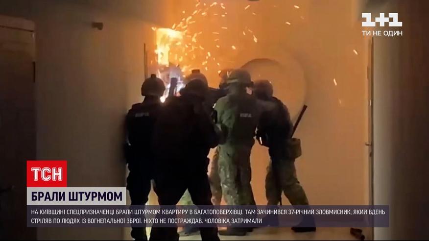 Спецоперация по задержанию вооруженного мужчины в Вишневом в Киевской области. Спецназовцам пришлось брать штурмом квартиру, где закрылся злоумышленник. В полицию позвонили по телефону жители многоэтажки. Неизвестный стрелял из огнестрельного оружия в сторону людей. Никто не пострадал. Злоумышленника задержали.