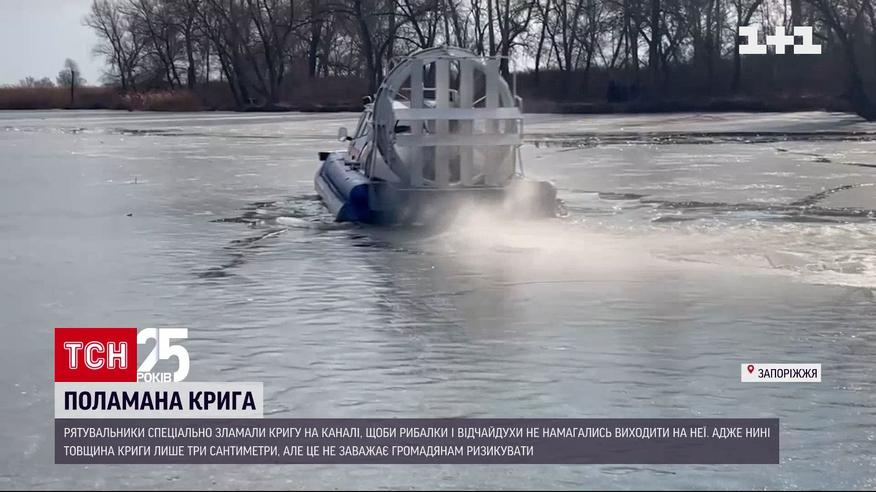 Ломали лед, чтобы остановить отчаянных, рискующих жизнью. В Запорожской области спасатели задействовали катер, чтобы предотвратить опасные ситуации. Ведь в городе Энегодар рыбаки вышли на канал, несмотря на плюсовую температуру. Толщина льда достигала трех сантиметров, поэтому люди могли провалиться в воду в любой момент. Спасатели едва тех отчаяние выйти на берег.