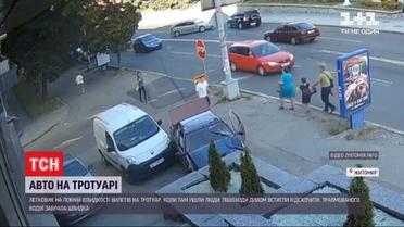 Вылетела на тротуар и чудом миновала пешеходов. В Житомире легковушка на полной скорости слетела с дороги и врезалась в парапет возле кафе. Именно в это время по тротуару шли двое взрослых и ребенок. Пешеходы едва успели отскочить, поэтому не пострадали. Момент зафиксировали камеры наблюдения. Травмированного водителя забрала скорая.