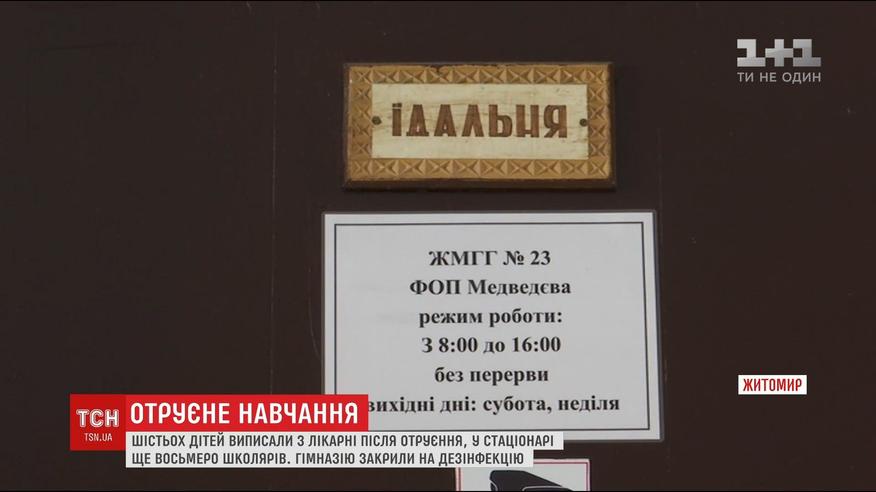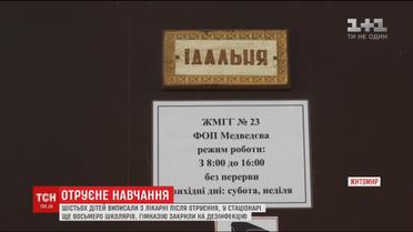 Шесть школьников уже выписали из житомирской больницы, куда они попали с симптомами отравления. Сейчас в стационаре находится восемь детей. Гимназию, где накануне массово отравились ученики, полностью закрыли на дезинфекцию. В столовой, коридорах и туалетах санкомисия уже собрала образцы.