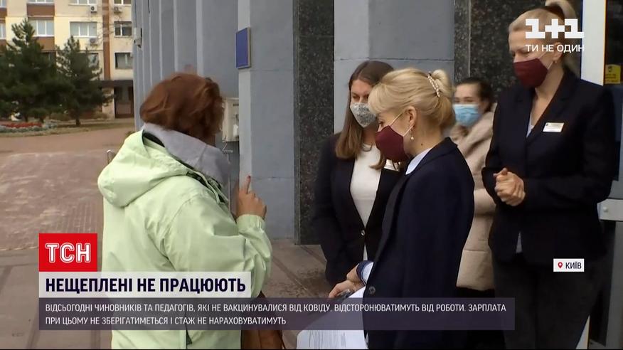 Без прививки – без работы. Сегодня чиновников и педагогов, которые не вакцинировались от COVID, будут отстранять от работы. Зарплата при этом не будет сохраняться и стаж не будет начисляться. Работать из дома отстраненным работникам тоже нельзя. Корреспондент ТСН поехал проверить, многие ли столичные чиновники не попали на работу. Детальнее – в прямом включении.