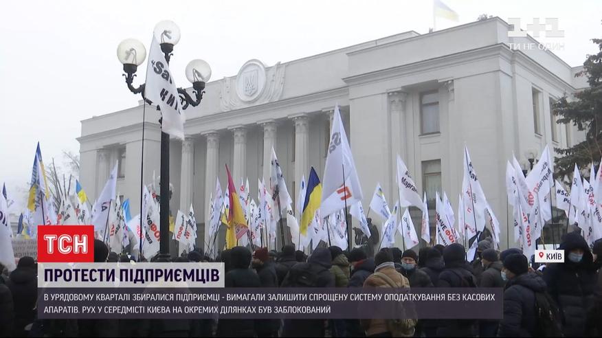 В течение всего рабочего дня движение в центре Киева блокировали митингующие. В правительственном квартале собрались предприниматели, которые с начала недели требуют оставить упрощенную систему налогообложения без кассовых аппаратов. Не обошлось без толкотни и даже сломанной части забора на тротуаре при ходьбе. Между тем, Верховная Рада приняла законопроект, который предусматривает введение налоговых каникул для ФЛП, а также списания для них налогового долга или отсрочку его выплаты. Охватить хотят более 200 тысяч ФЛП - их освободят от уплаты единого налога и единого взноса с декабря по май следующего года.