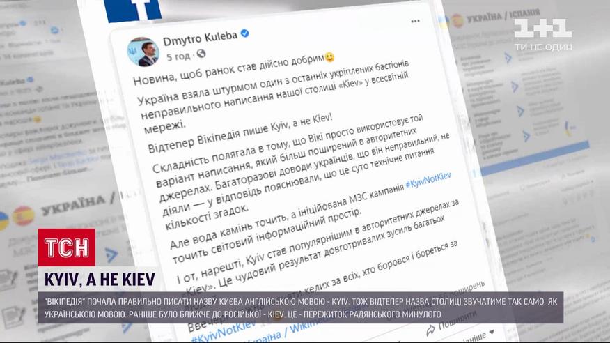 Киев, а не Киевом. Интернет-библиотека "Википедия" начала правильно писать название украинской столицы на английском. Об этом сообщил министр иностранных дел Дмитрий Кулеба. В слове изменили две буквы. Поэтому отныне на английском Киев будет звучать так же, как и на украинском. В соцсетях в последние годы продолжается кампания за правильное написание названия Киева на английском языке. Даже есть специальный хештеґ. Активисты убеждены: иначе пережитков советского прошлого не избавиться.