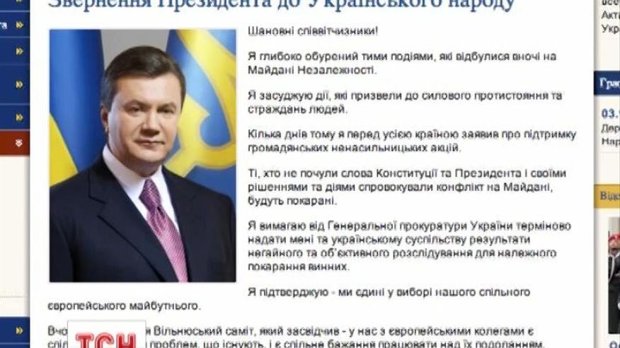 В обращение к народу, которое размещено на официальном сайте президента, Янукович отмечает, что глубоко обеспокоен событиями, которые произошли на Майдане Независимости.