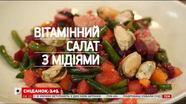 Сегодня Руслан Сеничкин предлагает приготовить изысканное украинско-итальянское блюдо - а именно, овощной салат с мидиями, источник всех необходимых витаминов и микроэлементов для осени. Для приготовления этого блюда нам понадобится 200 г фасоли, 300 г мидий, 200 г помидоров, 1 луковица, 1 отварная свекла, специи по вкусу.