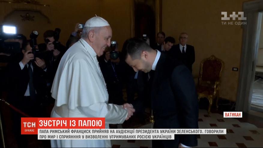 Владимира Зеленского принял на аудиенции Папа Римский Франциск. Президент поблагодарил Ватикан за помощь пострадавшим во время войны на востоке Украины гражданам и обратился к Папе с просьбой посодействовать освобождению украинцев, которых удерживают на Донбассе, в Крыму и в России.
