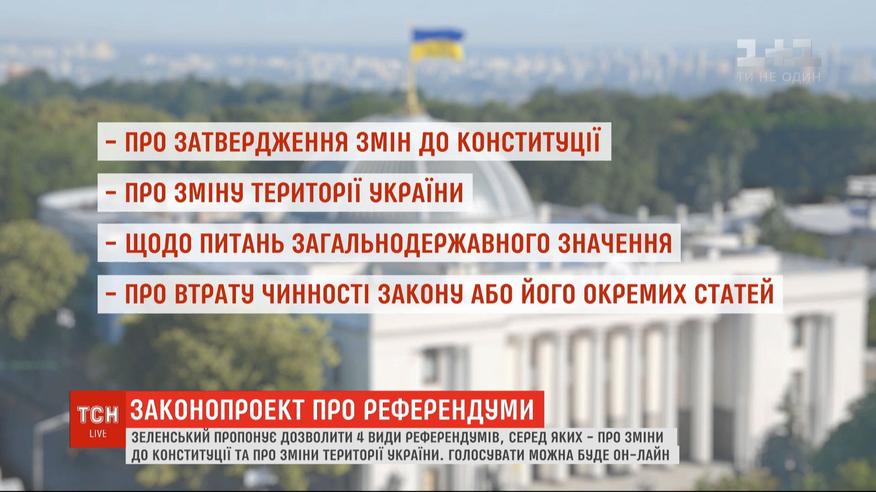 Изменять территорию Украины на референдуме - такую идею содержит новый президентский законопроект, зарегистрированный в Верховной Раде. Зеленский предлагает ввести четыре вида национальных референдумов: об утверждении изменений в Конституцию, об изменении территории Украины, по вопросам общегосударственного значения и об утрате одного из законов.