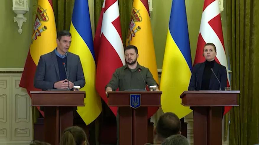 Президент Украины Владимир Зеленский, премьер-министр Испании Педро Санчес и премьер-министр Дании Мэтте Фредериксен после переговоров пообщались с представителями СМИ.