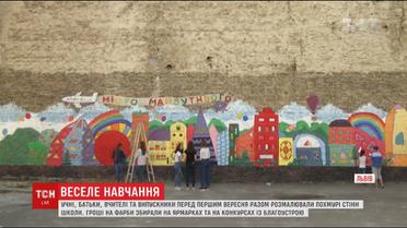 За кисти взялись и дети, и родители с учителями. И даже выпускники школы. Деньги на это собирали на конкурсах по благоустройству. А когда финансов не хватило, дети организовали ярмарки и продавали собственные изделия. Хотя рисунки сначала спланировали на бумаге, и потом уже на стенах начали фантазировать и импровизировать. На одной стене школьные художники изобразили город будущего, на другой - живописный Львов.