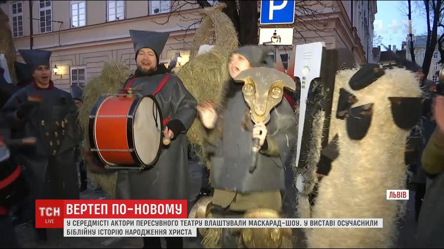 В гигантских масках герои вертепа танцевали, колядовали и играли на музыкальных инструментах - барабанах, бубне и даже трембите. Весь вертеп - без диалогов и расписанных ролей. Шоу собрало аншлаг - несколько сотен зрителей.