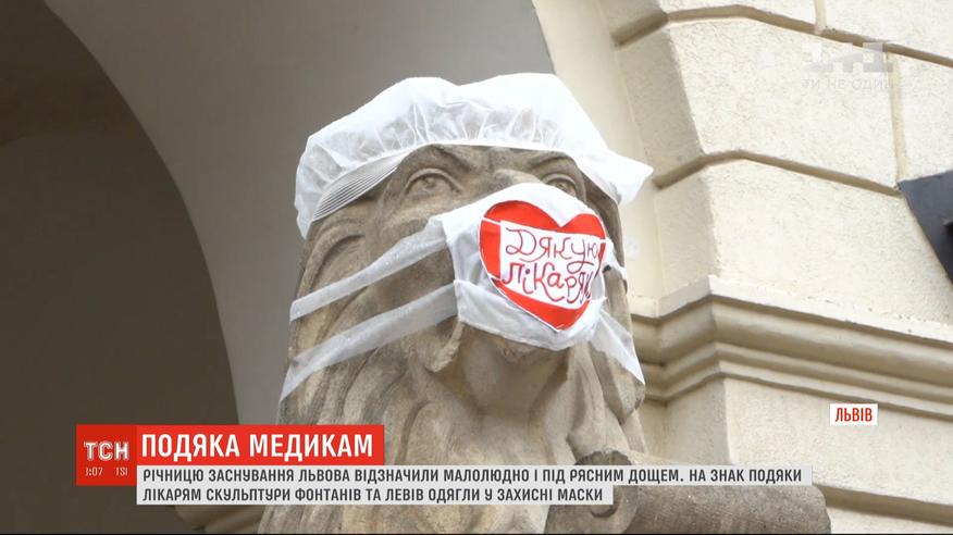 Во Львове в знак благодарности врачам скульптуры фонтанов и львов одели в защитные маски