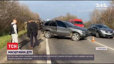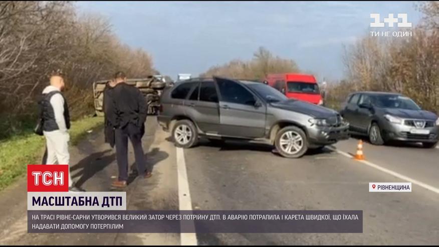 Большая тянучка на трассе "Ровно-Сарны". Там произошло крупное ДТП. Предварительно - четыре человека получили травмы, в аварию попала и скорая, которая ехала оказывать им помощь. Сейчас на месте событий работает ТСН.