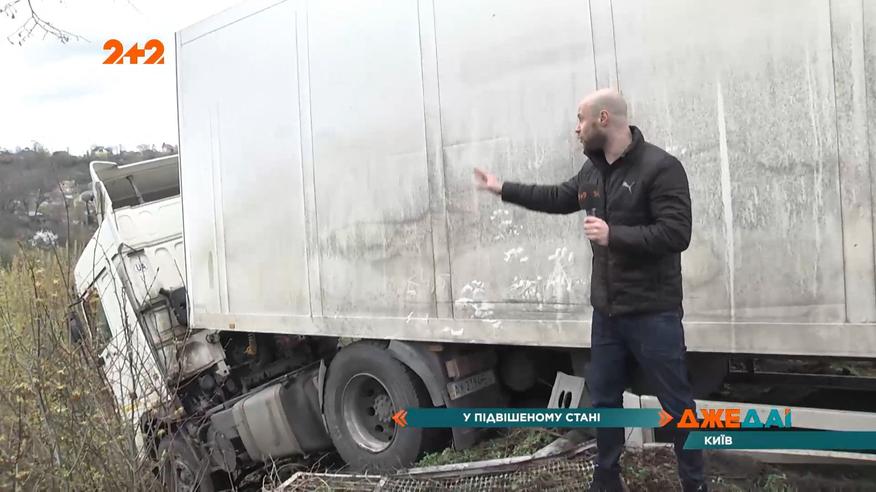 Проспект Валерия Лобановского - полоса общественного транспорта, как и тротуар, перекрыты длинномером, который просто слетел с дороги в кювет. Часть фуры фактически висит над пропастью и это очень опасно, но несмотря на это - всю ночь ее водитель находился в салоне. Полные выпуски смотрите на 1+1 video