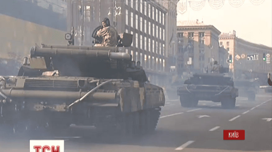 Корреспондент ТСН сообщает, что на центральную улицу Киева вывезли 200 единиц военной техники. Особых проблем с движением в центре столицы нету. Свидетели репетиции делятся впечатлениями от масштабов подготовки к празднику.