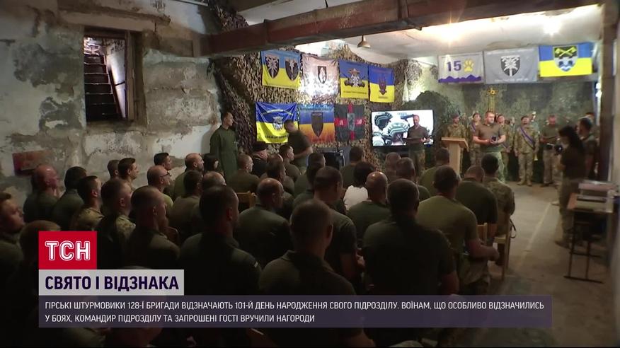 В глубоком укрытии, недалеко от линии фронта, без громкого празднования, горные штурмовики 128-й бригады отметили 101-й день рождения своего подразделения. Бригада сражается с оккупантами с 2014-го. 14 ее воинов с тех пор стали Героями Украины. Более двух тысяч бойцов получили за свои подвиги государственные награды! Полковник Дмитрий Лысюк - поблагодарил своих Воинов за стойкость и мужество. А главное - за качественную работу по уничтожению оккупантов. Воинам, которые особенно отличились в боях, командир подразделения и приглашенные гости вручили награды. Музыкальное поздравление, прозвучало и от оркестра Закарпатской бригады.