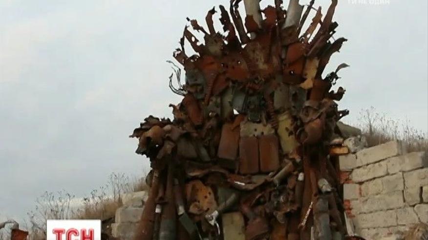 Трон весом 600 килограммов сделали ребята в зоне АТО. Это железное кресло украшено минами, снарядами, осколками, пулеметными лентами. Железное кресло выставили перед Запорожской ОГА, и местный предприниматель выиграл аукцион. Он должен купить за эти деньги тепловизор, камеру ночного видения и автомобиль для бойцов на передовой. Подарки поедут в район Донецкого аэропорта.