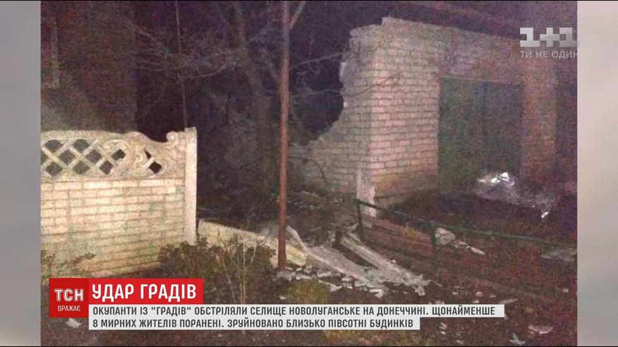 Выпустили по меньшей мере четыре десятка реактивных снарядов. Повреждено почти полсотни домов, некоторые сгорели дотла - это и частные дома, и пятиэтажки. Российские грады попали в местный садик, школу и амбулаторию. Разбиты газопровод и повреждены линии электропередач. Часть Новолуганского осталась без света.