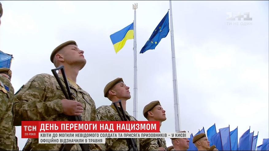 Цветы к могиле неизвестному солдату положили президент, премьер, мэр Киева, священники разных церквей и конфессий. А в музее Второй мировой войны присягу приняли несколько сотен призывников.