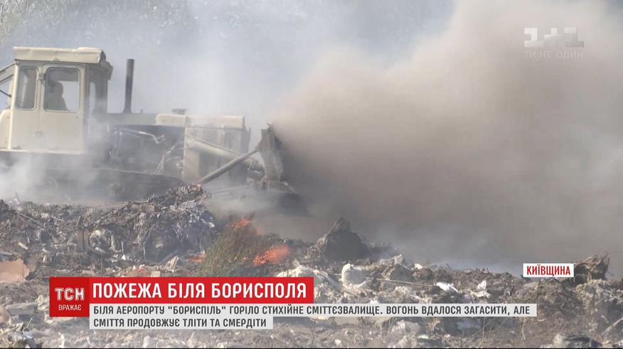 В нескольких сотнях метров от взлетно-посадочной полосы загорелась стихийная свалка. Накануне огонь охватил площадь в несколько гектаров, запах дыма слышали жители Борисполя и близлежащих сел. В настоящее время большинство очагов пламени удалось потушить, но мусор продолжает тлеть.