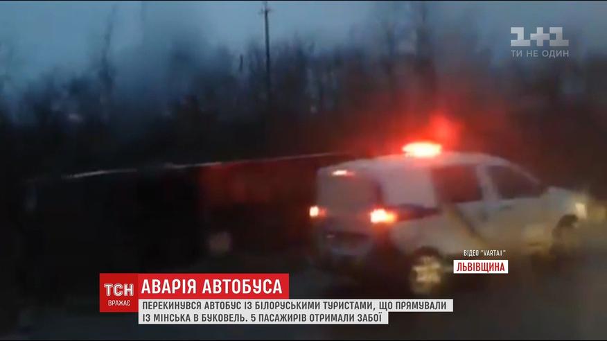 Люди направлялись из Минска в Буковель. По предварительным данным Нацполиции, водитель не справился с управлением и вылетел в кювет. В салоне было более сорока пассажиров. Пятеро получили легкие ушибы и синяки.