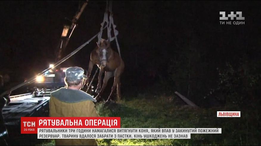 В селе Подберезцы животное паслось и забрело на территорию заброшенного предприятия - там упало в заброшенный пожарный резервуар. Воды было немного, но конь не мог сам выбраться. Владелец вызвал спасателей. Чрезвычайными говорят - хорошо, что конь вел себя спокойно и не брыкался, иначе мог нанести вред и себе, и своим спасителям.