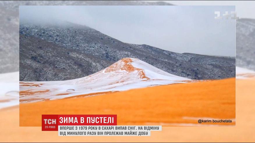 Это редкое явление снял на камеру фотограф Карим Бучетата. В отличии от прошлого раза, когда в 1979 году снег продержался на песке всего полчаса, на этот раз он пролежал почти сутки. Город Айн-Сефра, вокруг которого Бучетата делал фотографии, называют вратами Пустыни.