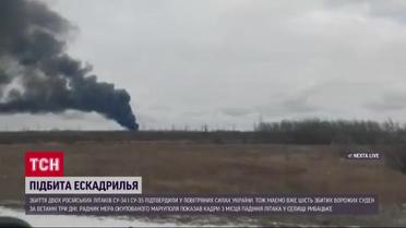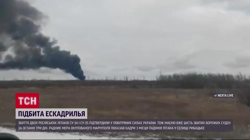 Сбитие двух российских самолетов Су-34 и Су-35 подтвердили в Воздушных силах ВСУ. Поэтому имеем уже шесть сбитых вражеских самолетов за последние три дня. И кадрами с места падения российского самолета в поселке Рыбацкое под Мариуполем поделился советник мэра временно оккупированного города Петр Андрющенко. По его словам, самолет сейчас в море, а село - перекрыто военной комендатурой россиян. Между тем в телеграмм-каналах сообщают о "прилете" во временно оккупированной Макеевке. По сообщениям, пылает там или склад с топливными материалами, или нефтебаза - на видео можно увидеть мощный столб дыма. Утром воздушная тревога звучала и в Севастополе, а Крымский мост перекрыли из-за взрывов. Детали - в ТСН.