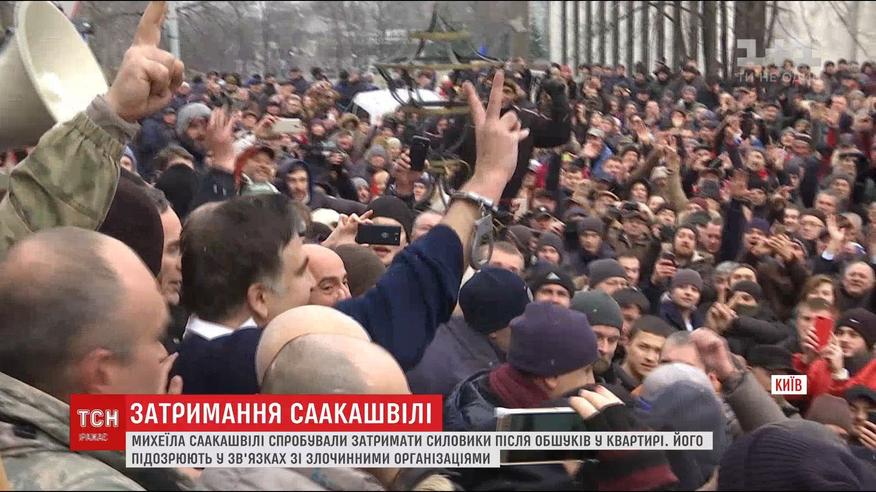 СБУ совместно с Генпрокуратурой в семь утра отправились с обыском в дом политика. Там же ему объявили подозрение в связях с преступными группировками и получения денег от окружения Януковича. Задержать же Саакашвили было не просто. Сначала он бежал на крышу. Когда силовики вернули грузинского экс-президента на землю и посадили в автобус, транспорт заблокировали сторонники политика.