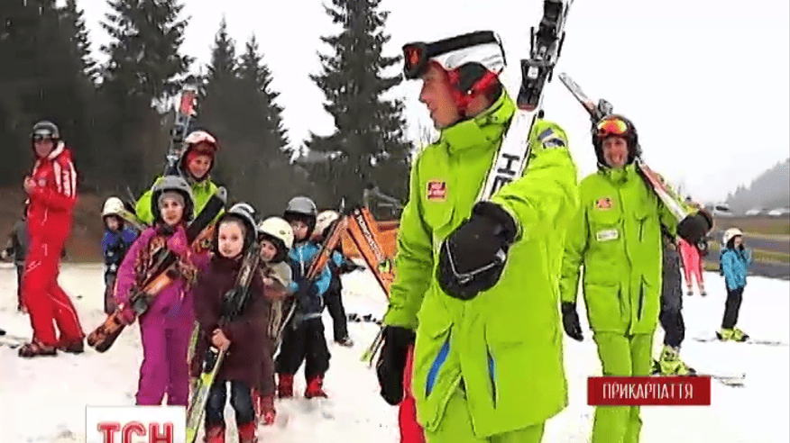 Подарочные сертификаты на экипировку и бесплатное занятие с инструктором им вручил туристический курорт "Буковель". Социальная программа действует уже третий год подряд. Первоклашки из Ивано-Франковска в Буковель приехали учиться. Занятие не за партами, а на склоне с лыжами. Громко смеяться и играть во время "урока" не возбраняется - наоборот, сами инструкторы со своими учениками впадают в детство.
