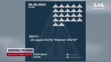 Воздушные силы Украины в ночь на 5 июня сбили 22 вражеских беспилотника в Николаевской, Херсонской, Днепропетровской, Сумской и Полтавской областях. В целом по Украине террористы на этот раз применили 27 ударных дронов типа "Шахед" из российского Курска и мыса Чауда в Крыму. Детали – в ТСН.
