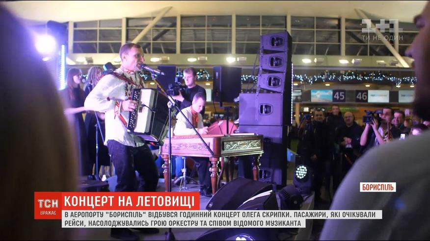 В столичном аэропорту "Борисполь" заиграл оркестр. В течение часа пассажиры наслаждались украинскими песнями - их исполнял певец Олег Скрипка. ТСН видела все собственными глазами.