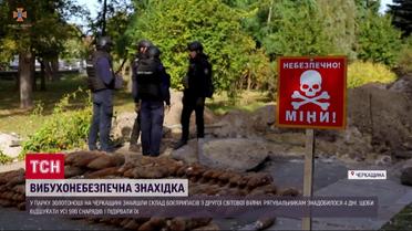 В центре города Золотоноши Черкасской области прямо в парке возле дома детского творчества нашли настоящий склад ржавых снарядов. Обнаружили его во время копания траншеи и сразу вызвали спасателей. Саперы ГСЧС четверо суток подряд обследовали территорию и достали из земли 590 снарядов различного калибра. По свидетельствам местных жителей, во время второй мировой войны в доме детского творчества были штабы - и нацистской, и советской армий. Очевидно, неподалеку от них хранили боеприпасы. И вот через восемь десятков лет находка внезапно открылась. Снаряды взорвали в поле недалеко от города. Детали - в ТСН.