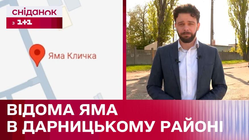 Дарницкий район столицы, улица Якова Гниздовского. Здешнюю яму называют ямой Кличко. Предыстория этого названия неизвестна. Но даже на гугл карте можно найти эту локацию, у нее уже есть даже свой рейтинг. Пока там 3 отзыва и 5 звездочек. Очевидно люди пытаются привлечь внимание местных властей, поэтому к этому делу приобщаемся и командой Сниданка с 1+1.