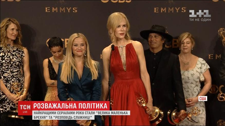 Главные награды достались ленте "Рассказ Служанки". А актрисы Элизабет Мосс и Энн Даун выиграли статуэтки за главную и второстепенную роли. Среди минисериалов триумфатором стала лента "Большая маленькая ложь" с Николь Кидман в главной роли: она собрала пять наград. Свою статуэтку получил и Дональд Трамп в исполнении Алика Болдуина.