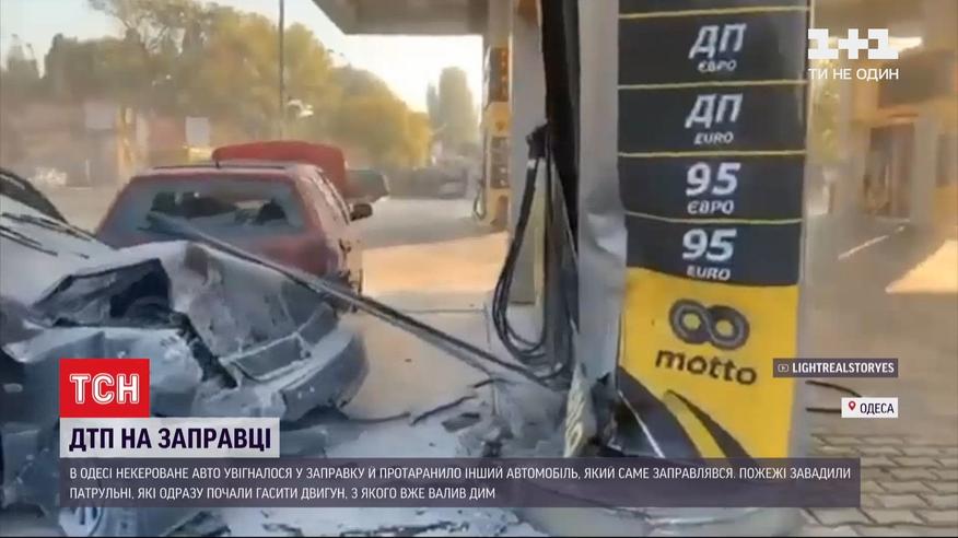 За мгновение от взрыва. В Одессе неуправляемое авто влетело в заправочную станцию, протаранив другую машину, которая там как раз заправлялась. Пожару помешали патрульные, которые ехали позади машины и заметили, что водитель потерял управление. Полицейский сразу выскочил из огнетушителем и начал тушить двигатель, с которого уже валил дым. Пришли на помощь и работники АЗС, поэтому трагедии не произошло. По данным полиции, 24-летний водитель потерял управление и слетел с дороги, когда на скорости переходил в другой ряд. По словам же очевидцев, осуществить планируемый маневр ему помешало другое авто.