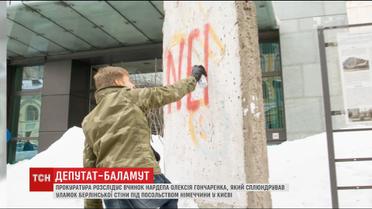 Киевская прокуратура начала расследование поступка народного депутата Алексея Гончаренко, который осквернил обломок Берлинской стены под Посольством Германии в Киеве в знак протеста против скандальной мысли посла Райхеля. По Уголовному кодексу, депутату может грозить до трех лет.