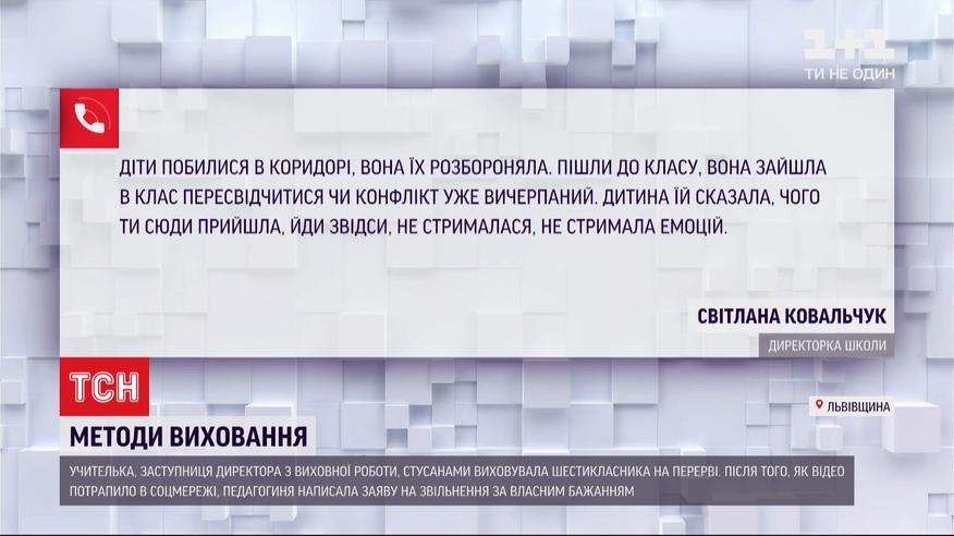 Дергала и била по голове. Во Львовской области учительница украинского языка и литературы, заместитель директора по воспитательной работе, пинками воспитывала 6-классника при классе. Инцидент произошел на перемене в школе села Потелич Жовковского района. Конфликт снял кто-то из одноклассников и впоследствии изложил в соцсеть. Узнав о непедагогическом поступке, в районном отделе образования рекомендовали директору уволить педагога, но учительница уже написала заявление по собственному желанию.