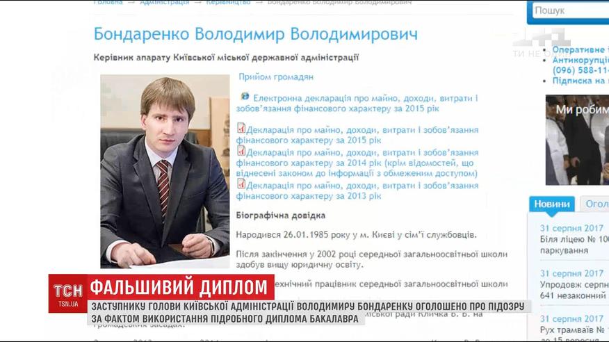Ряд экспертиз подтверждает, что диплом юриста фальшивый. В университете такого студента также не знают. На основе поддельного диплома Бондаренко успел получить второе образование в Киевском университете имени Шевченко. Сейчас следователи готовят документы для избрание меры пресечения чиновнику.