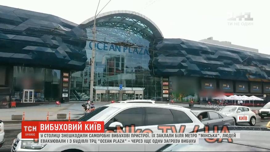 Мощные взрывы в столице. Рвануло у столичного метро "Минская". Впоследствии оказалось - это взрывотехники обезвредили два самодельных взрывных устройства. Их нашли на рынке, заложенными между машиной и автокиосками. О заминировании в полицию сообщил аноним. Из-за другого сообщения о заминировании пришлось эвакуировать и большой торговый центр в центре - "Оушен Плаза" и Городской апелляционный суд. К вечеру людей стали выводить и из центрального железнодорожного вокзала и международного аэропорта "Киев". Полицейские получили сообщение и об их заминировании.