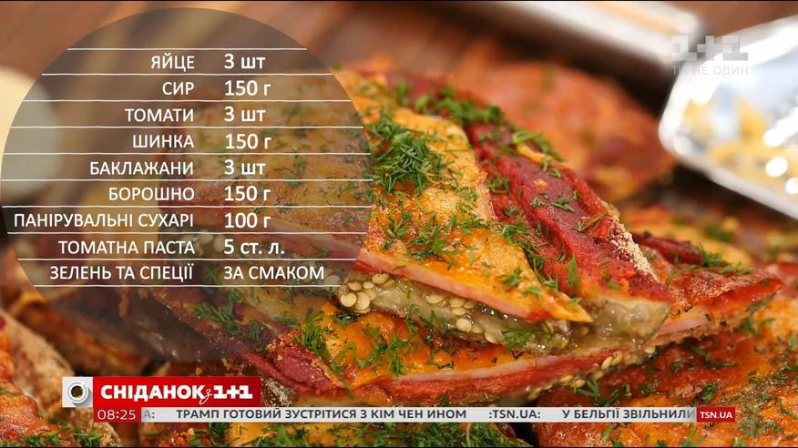 Это блюдо - беспроигрышное на любом столе. Записывайте, вам понадобится: яйцо - 3 шт, сыр - 150 г, томаты - 3 шт, ветчина - 150 г, баклажаны - 3 шт, мука - 150 г, панировочные сухари - 100 г, томатная паста - 5 ст. л., зелень и специи.