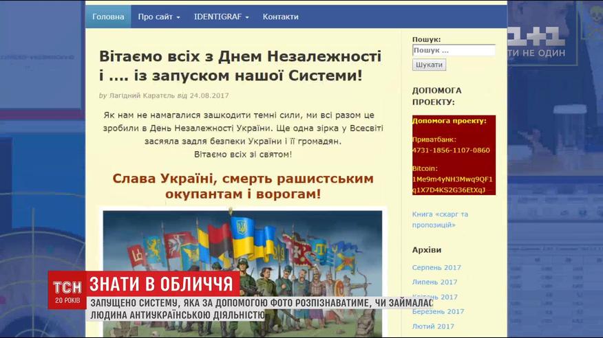 Ко Дню Независимости запущена система автоматического распознавания лиц людей, которые посягнули на независимость и территориальную целостность Украины. На сайт "айдентиграф" может зайти каждый, и с помощью фото лица проверить, случайно ли он не засветился где-то со своей антиукраинской деятельностью.
