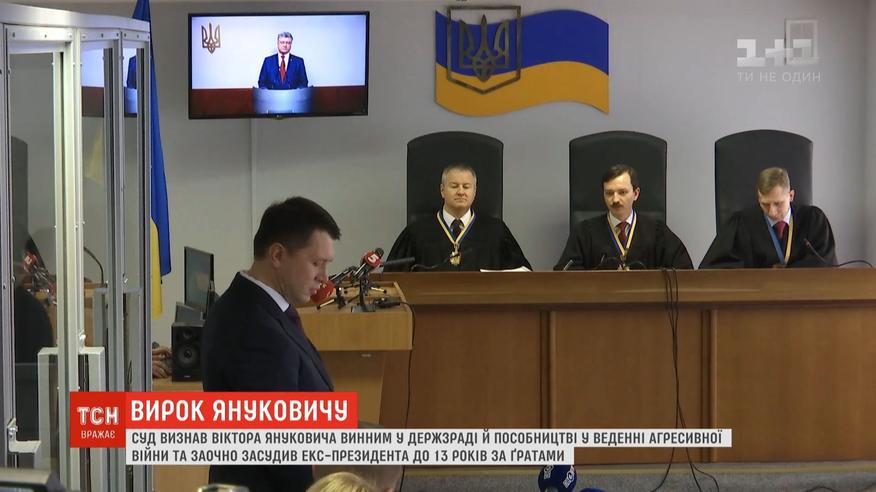Оболонский райсуд столицы заочно признал президента-беглеца виновным в государственной измене. Судьи объявляли приговор по очереди 8 часов. Сам судебный процесс длился почти 2 года, а материалы дела собрали сотню томов.