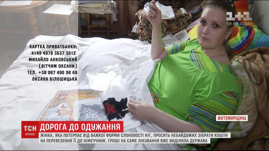 Ее вес 350 килограммов, ноги - в десять раз больше нормы. Деньги на лечение за рубежом уже выделил Минздрав, но женщину еще надо довезти до Германии. И теперь семья больной обращается к неравнодушным с просьбой о помощи, ведь только транспортировка Оксаны будет стоить 100 тысяч гривен.