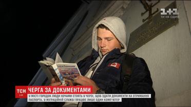 Чтобы сдать документы на получение паспортов, люди приходят ночью под здание. Больше всего беспокоятся за будущих абитуриентов, которых без ID-карточек, их не допустят к регистрации на ВНО. А очередь продвигается медленно, потому что работает только один компьютер, который только недавно отремонтировали.