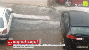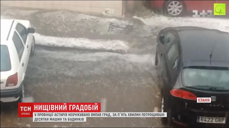 За пять минут град в Испании разбил машины, крыши домов и окна. На севере страны, в провинции Астурия, неожиданно с неба посыпались огромные ледяные шарики. Сильный ветер, сопровождавший стихию, поломал немало деревьев. Вслед за градом еще и начался ливень, повлекшей паводки.