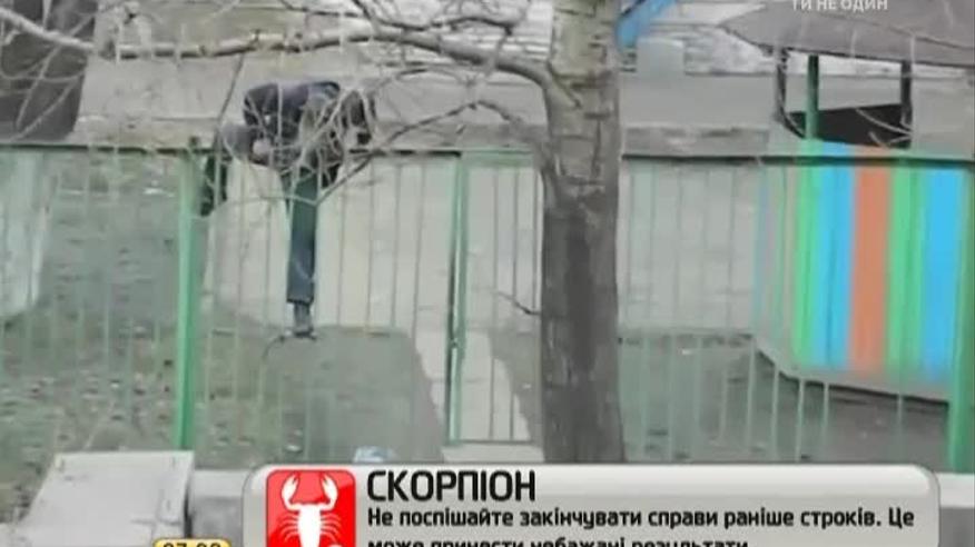 Мужчина сначала пытается протиснуться сквозь решетки забора - однако неудачно. Далее он попытался перелезть